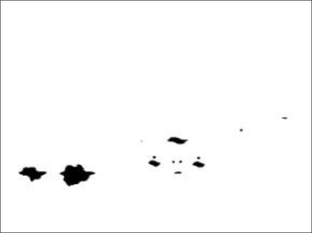 Accordingly, to screen out non-vehicle illuminant objects such as street lamps and traffic lights located above half of the vertical y-axis (i.e., the “horizon”), and save the computation cost, the bright object extraction process is only performed on the bright components located under the virtual horizon (Figure 4). Accordingly, as Figure 5 shows, after applying the bright object segmentation module on the sample image in Figure 2, pixels of bright objects are successfully separated into thresholded object planes under real illumination conditions.