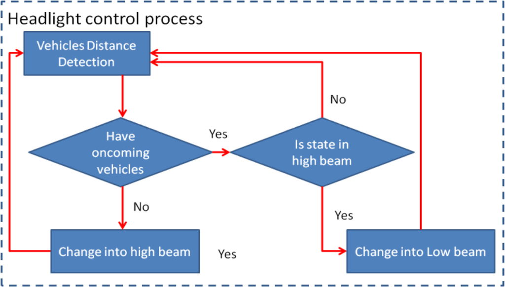 The proposed traffic event warning and recording subsystem is an automatic control process in the proposed system. This automatic control process includes a vehicle headlight control process and a traffic event video recording process. When any oncoming vehicles are detected, the headlight control process automatically switches the headlights to low beam, and then reverts to high beams once the detected vehicles leave the detection zone. The warning voice and traffic event video recording process are also activated to notify drivers to slowly decelerate when the distance from the detected preceding vehicles is too small, and to record a traffic event video using the MPEG4 video codec [27,28]. Figures 7 and 8 present flowcharts of the headlight control process and the traffic event video recording process, respectively.