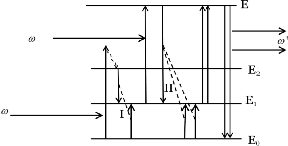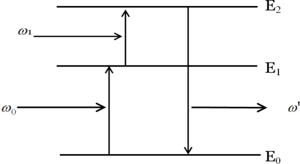 PA process is a more complex process, which can be characterized by three distinct nonlinear behaviors: transmission, emission, and rise time on the pump power intensity with generally the existence of a critical pump threshold. Take a four-energy system as an example (Figure 2), in which E0, E1 and E2, and E represents ground state, intermediate states, and upper excited states, respectively.