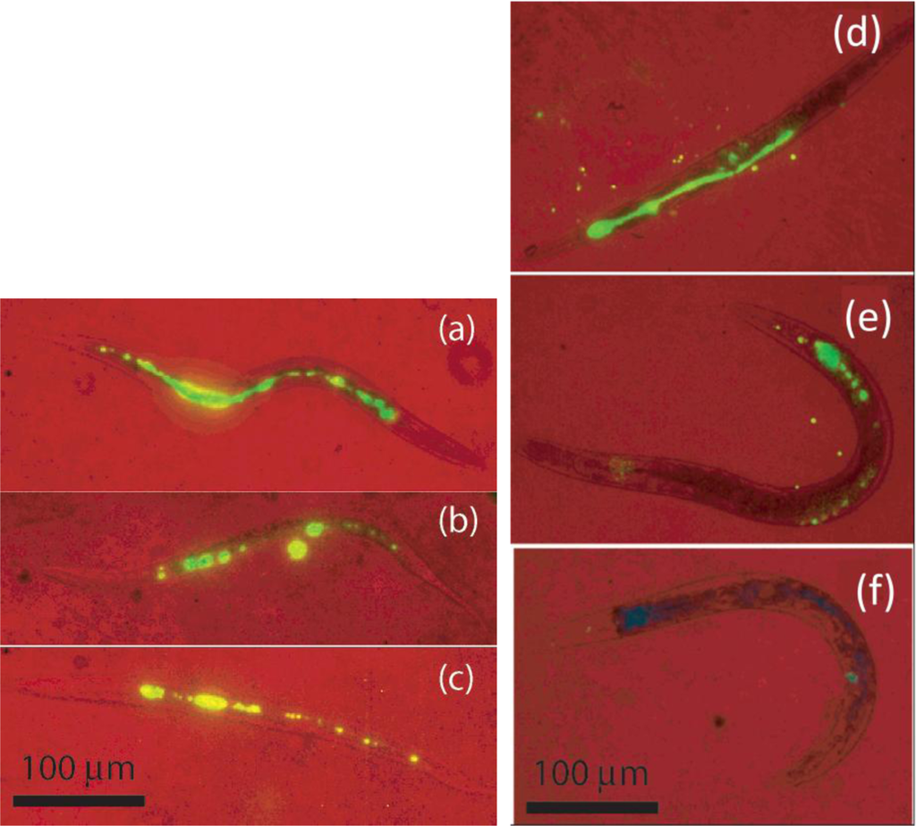 Lim et al. [22,53] performed in vivo and scanning electron microscopy imaging of UCNs in C. elegans due to its short life cycle, rapid growth, and appropriate size to optical microscopy. In their study, C. elegans were fed with UCNs and imaged at fixed time intervals in order to track the movement of the phosphors through their digestive system. No significant change in the phosphors was monitored up to 24 h and after feeding the worms with food (Figure 10), the phosphors were secreted in under 2 h. It demonstrated that UCNs were nonbleaching, biocompatible, and nontoxic, which make them ideal candidates in the biological system.