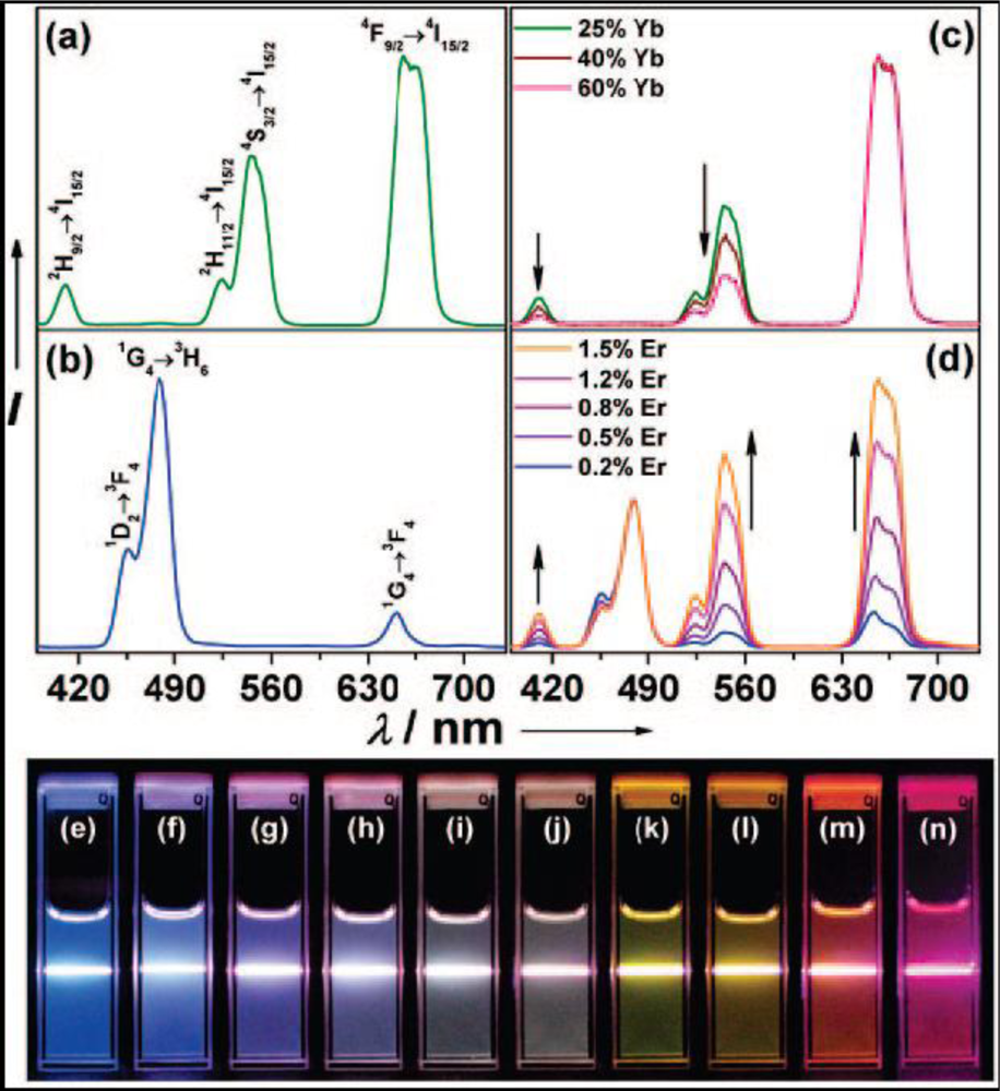 The upconversion phenomenon has been observed in transition metals, actinides, but mainly in the rare earth (RE) elements, which contain the lanthanide (Ln) series, yttrium, and scandium [1]. Ln3+ ions have special 4fn 5d0–1 inner shell configurations that are well-shielded by outer shells and have abundant and unique energy level structures. These Ln3+ ions can exhibit sharp luminescence emissions via intra-4f or 4f-5d transitions. Their remarkable luminescence properties, such as narrow bandwidth, long-time emission, and anti-Stokes emission, have been widely applied in lasers, solar cells, analytical sensors, optical imaging, photodynamic therapy, and so on. At present, the low luminescence efficiency is one of the main limiting factors. Therefore, to obtain the highest upconversion luminescence efficiency, it is critical to choose an appropriate host material with lower phonon energy (high phonon frequencies of the host lattice lead to nonradiative relaxation). To date, host materials, including fluoride, chloride and bromide, have been shown to enhance upconversion luminescence intensity. Most of chlorides and bromides are sensitive to moisture, and thus are not suitable for labeling biomolecules (used mostly in aqueous solutions) [2]. RE fluorides, mainly REF3 and AREF4 (A = alkali), have been considered as an excellent host material due to their high refractive index and high transparency arising from low-energy phonons. These two advantages further lead to low probability of nonradiative decay and increased luminescence quantum yield.