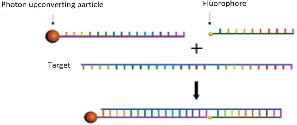 DNA/RNA analysis is of great importance in molecular biology, genetic, and molecular medicine. Great effects have been invested in the precise concentration detection, such as metal nanoparticle-based analysis [105–108]. In recent years, UCNs were also used for the sensitive detection of oligonucleotides. For example, van de Rijke et al. [52] and Corstjens et al. [109] used UCNs as direct labeling reagents to detect single strand nucleic acids. A new design of a nucleotide sensor by Zhang et al. [110] used UCN as energy donor and the other fluorophore as an energy acceptor in a sandwich assay format (Figure 13). In the presence of UCNs and IR irradiation, the fluorophore was brought close to the UCN and energy transfer took place, leading to the light emission from the fluorophore. The target oligonucleotide can be detected by monitoring the fluorophore emission. This sensor displayed high sensitivity (1.3 nM), high specificity, and self-calibration capability. A general aptasensor for detection of various target molecules was reported recently by Liu et al. [111], which was based on UCNs-graphene oxide FRET. This proposed design can be further extended for sensing other kinds of molecules as well as causing structure conformations of ssDNA, which have shown its great potential in clinical diagnostic and biosensing techniques.