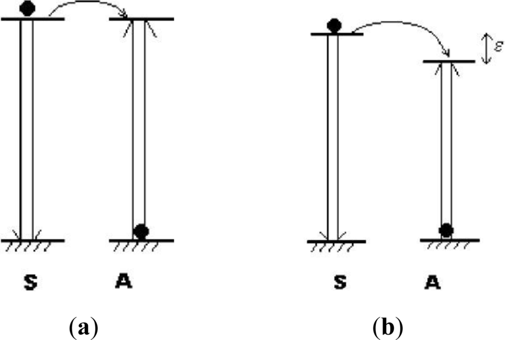 ETU is by far the most efficient upconversion process in RE doped nanomaterials and it is independent of the pump power. In the process of ETU, two situations, resonant non-radiative transfer and phonon-assisted non-radiative transfer in two-ion-involved system, will be mainly discussed (Figure 3) [1]. When the excited energies of sensitizer (S) and activator (A) are nearly equal and the distance between them is near enough, energy can be transferred from S to A, exciting A from its ground state to excited state before S emits photons. In phonon-assisted non-radiative transfer, an energy mismatch exists between S and A ions, so phonon assistance is necessary to have the energy transfer process.