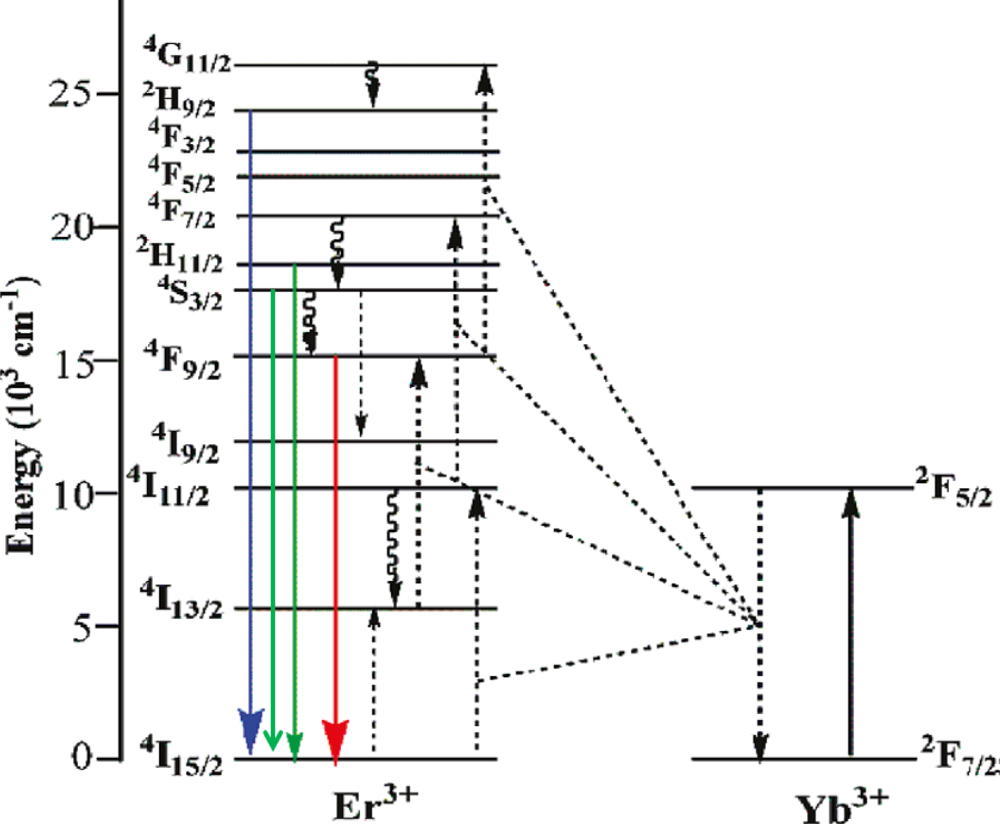 For example, in the system of NaYF4:Yb3+ (Figure 4) Er3+ UCNs, red, blue, and green light can be emitted through this process. The Yb3+ ion, with its excited state 2F5/2, has an energy comparable to 4I11/2 (Er3+), which can act as a sensitizer for Er3+ and transfer its energy to an unexcited Er3+ ion through the energy transfer process: 2F5/2 (Yb3+) + 4I15/2 (Er3+) → 2F7/2 (Yb3+) + 4I11/2 (Er3+). By further cross relaxation and phonon-assisted process, red emission (∼654 nm) can be emitted from 4F9/2 [2F5/2 (Yb3+) + 4I13/2 (Er3+) → 2F7/2 (Yb3+) + 4F9/2 (Er3+)]. The blue (∼408 nm) and green luminescence emissions (∼526 nm and ∼533 nm) are emitted from2H9/2 – 4I15/2 and 2H11/2 – 4I15/2 (also 4S3/2 − 4I15/2) via similar ways, respectively.