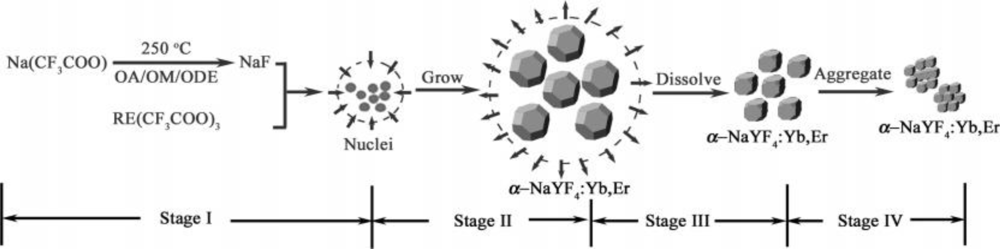Thermal decomposition, which gives well shaped particles, with good size control, after a relatively short reaction time, is one of the most popular methods. It usually involves dissolving organic precursors in high-boiling organic solvents with the assistance of surfactants. The commonly used organic precursors are trifluoroacetate compounds, and the surfactants typically have polar capping groups and long hydrocarbon chains, such as oleic acid (OA), omeylamine (OM), and 1-octadecence (ODE). Mai et al. [27] systematically investigated the growth mechanism of nanocrystals and pointed out that the trifluoroaetate precursors in hot surfactant solutions went through a unique delayed nucleation pathway. The synthesis reaction was separated as four stages including nucleation in a delayed time, particle growth by monomer supply, size shrinkage by dissolution, and aggregation. Figure 5 illustrates the synthesis steps of α-NaYF4:Yb3+, Er3+ UCNs and by varying the reaction time, concentration of reagents, and reaction temperature, various sizes and shapes of NaYF4:Yb3+, Er3+ UCNs can be obtained.