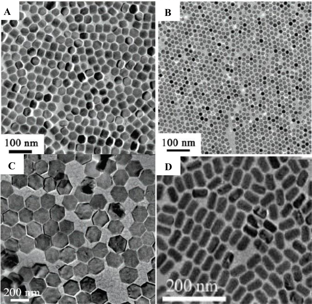 Figure 6 shows a few examples of RE fluoride nanomaterials synthesized by thermal decomposition method, which are well-shaped and monodispersed. Although it gives a narrow size distribution and good shape control, the thermal decomposition method still suffers some drawbacks. It normally requires high reaction temperature (250–330 °C), organic solvents, and an oxygen-free with inert gas protection. In addition, most of the synthesized nanomaterials are stabilized by surfactant, which brings difficulties in the biological applications. Further surface modification is also required.