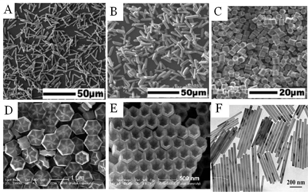 Hydrothermal synthesis is a typical solution-based approach, which is usually employed under high temperatures and pressures [5,31,35,36]. Unlike the thermal decomposition method, which can only use an organic compound as a solvent, hydrothermal synthesis can occur in a water-based system and at a lower reaction temperature (160–220 °C) in a relatively environmentally friendly approach. It is an effective and convenient process in preparing inorganic materials with diverse controllable morphologies and architectures. For example, various shapes of hexagonal NaYF4 crystals, such as prism, disk, tube, rod, and octadecahedral shapes were synthesized by applying this method [37,38]. Recently, in Lin’s group, the mechanism of synthesizing different shapes of RE fluoride nano-/microcrystals was systematically investigated [33]. It was reported that the organic additive trisodium citrate, the fluoride source, and pH value have great effects on the shapes (Figure 7).