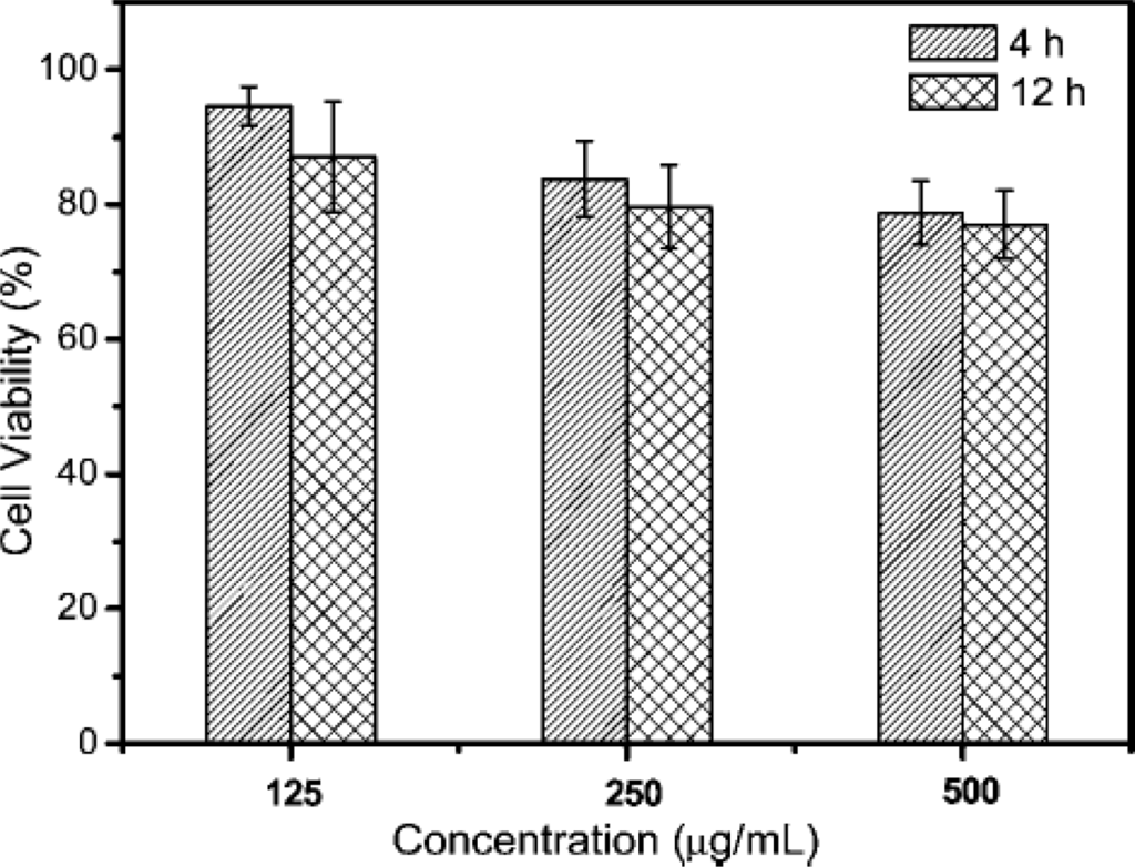 Due to the rapid progress in developing UCNs’ applications in the biological field, the safety and toxicity of UCNs are a growing concern and extremely important. The most common methods to evaluate the toxicity are through cellular morphology and mitochondrial function, such as methylthiazolyl tetrazolium (MTT) and 3-(4,5-dimethylthiazol-2-yl)-5-(3-carboxymethoxyphenyl)-2-(4-sulfophenyl)-2H-tetrazolium (MTS) assays. Studies have shown that UCNs are non-/low-toxicity to a broad range of cell lines [4,6,10,18,53,54]. The cells were usually treated with different concentrations of UCNs for various time range, and by measuring the cell viability percentage, the UCNs toxicity was determined. For example, in Zhang’s group, they studied both polyethyleneimine (PEI) [55] and silica-coated [18] UCNs’ cell toxicity. In the case of silica-coated UCNs, although the cell viability decreased as a function of both concentration and time, 93.4% of skeletal myoblast cells and 93.2% of BMSCs cells were still alive under 24 h incubation at a concentration of 1 μg/mL, which indicated great biocompatibility [18]. Recently, Li and co-workers investigated the UCNs’ long-term in vivo distribution and toxicity [56]. Their findings show that the mice survived for 115 days after the intravenously injection 15 mg/kg of UCNs with no apparent adverse effects observed to their health, indicating the possibility for long-term targeted imaging and therapy studies in vivo. Hu et al. treated the KB cells with different concentrations of PEG-modificed UCNs (Figure 8) [6]. Even at a high concentration of 250 μg/mL, the cell viability still remained above 80%, showing the low cytotoxicity of the nanoparticles.