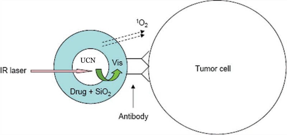 UCN satisfies all the requirements due to its deeper penetration (capable of converting NIR light into visible light), lower toxicity, higher stability, and easier surface modification. UCNs used in PDT are usually pre-coated with a shell, which has the functions of: (1) doping matrix for photosensitizers; (2) specific target on tumor cells; and (3) UCNs stabilization. The NaYF4:Yb/Er UCN is one of the most common used UCN in PDT due to its high UC efficiency [19,75–77]. Zhang and co-workers first demonstrated a novel design for PDT based on UCNs for the treatment of bladder cancer cells (Figure 9) [78]. UCNs were coated with a layer of mesoporous silica shell, in which the photosensitizers were doped. An antibody, which had specific antigens that were expressed on the target cell’s surface, was covalently attached on the surface of the silica shell. Due to the spectra overlap between photosensitizers’ absorbance and UCNs’ emission, the photosensitizer-doped UCNs can generate 1O2 under NIR irradiation and further kill the target cells. The generation of 1O2 is usually indicated by the quenching phenomenon of ABDA or ADPA.