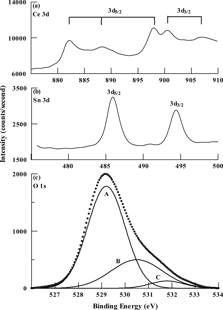 Detailed spectra in the Ce 3d, Sn 3d, and O 1s core level regions are shown in Figure 3. CeO2 has a relatively complex Ce 3d XPS spectrum that consists of six peaks, which correspond to the three pairs of spin-orbit doublets of oxidized CeO2 [13]. The measured Ce 3d spectrum (Figure 3(a)) clearly shows five peaks at binding energies of 882.4 eV, 888.1 eV, 897.8 eV, 900.4 eV, and 906.7 eV. The first three peaks correspond to Ce 3d5/2 and the last two peaks correspond to Ce 3d3/2. An additional peak at a binding energy of 916.6 eV was observed in the survey scan (shown by the arrow in Figure 2).