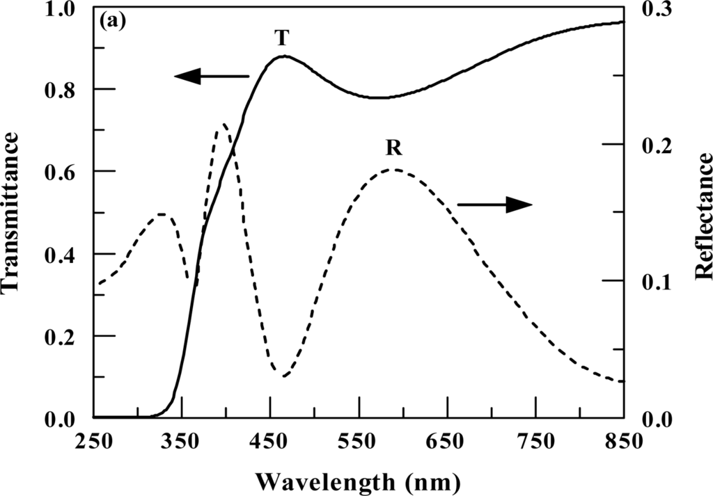 The normal-incidence reflectance and transmittance spectra, in the wavelength range λ = 250 – 850 nm, are shown in Figure 4. The transmittance spectra are obtained by dividing the measured transmittance by that of a fused silica substrate. The optical properties of the films can be used to estimate their porosity. The columnar microstructure of the films indicates the presence of voids within the films, which results in the films being porous. These voids (pores) may be filled with moisture (water) or air. The average packing density (p) is defined as the volume occupied by the solid part divided by the total volume occupied by the solid and voids. In the transparent region (λ > 500 nm), the refractive index of a film (nf) can be estimated from the minima in the transmittance spectra. The relation between the refractive index of the film (nf) and the packing density is given by [18]: