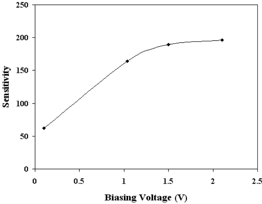 Interaction of gaseous species with a thin film includes two steps [22]. First, oxygen from the ambient adsorbs on the surface of the film, and extracts electrons from the material, ionizes to O2−, O− or O2− depending on the operating temperature of the sensor (Top) [23–25]. The second step involves the reaction of the tested gas (CO in present case) with the adsorbed oxygen species. The introduction of a reducing gas (such as CO) decreases the resistance of the sensing film. For reducing gases, the sensitivity S is defined as (ΔR/RCO) × 100 where ΔR = (Rair − RCO) [4], where Rair is the resistance of the film in air, and RCO is the resistance of the film in the presence of CO. The sensitivity was measured as a function of sensor temperature and biasing voltages for different CO concentrations. Figure 6 shows the dependence of the sensitivity on the sensor bias voltage for SnO2 mixed CeO2 sensor at the optimum temperature of 430 °C, with a CO concentration of 500 ppm. Figure 6 depicts that there was significant variation in response for SnO2 mixed CeO2 sensor as the biasing voltages were increased.