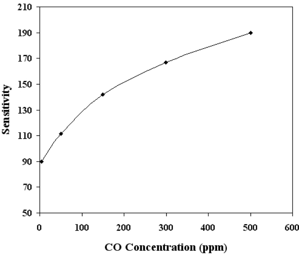 Similar results were observed for other temperatures in the range 300–500 °C. Therefore, from these findings, the bias voltage was fixed at 1.5 V for subsequent experimental work. The effect of biasing voltages has been discussed in detail [10,26,27]. Briefly the effect of applied biasing voltage perhaps could be visualized as following; the applied biasing voltage would increase/decrease the Schottky barrier height (created by O− adsorption), which in turn would increase/decrease the threshold CO concentration for the p-n or vice versa transitions. Figure 7 shows the sensitivity variation as a function of operating temperature (in the range 300 °C to 500 °C) for SnO2 mixed CeO2 film of thickness 220 nm and CO concentrations of 500 ppm. The inset of Figure 7 shows the peak value of the sensitivity for SnO2 mixed CeO2 is 430 °C. For the optimum operating temperatures 430 °C, the dependence of sensitivity on CO gas concentration was also investigated. The results are given in Figure 8, which shows that the sensor was capable of detecting CO gas concentrations as low as 5 ppm. It is clearly evident from Figures 7 and 8 that the SnO2 mixed CeO2 thin film gas sensor was highly sensitive to CO.
