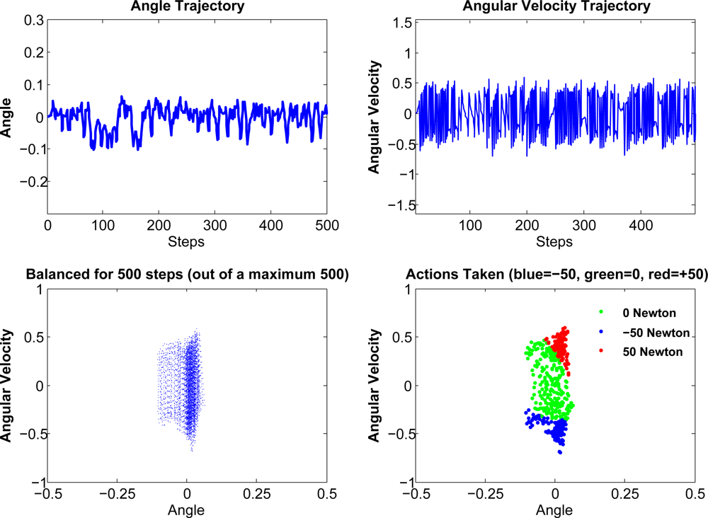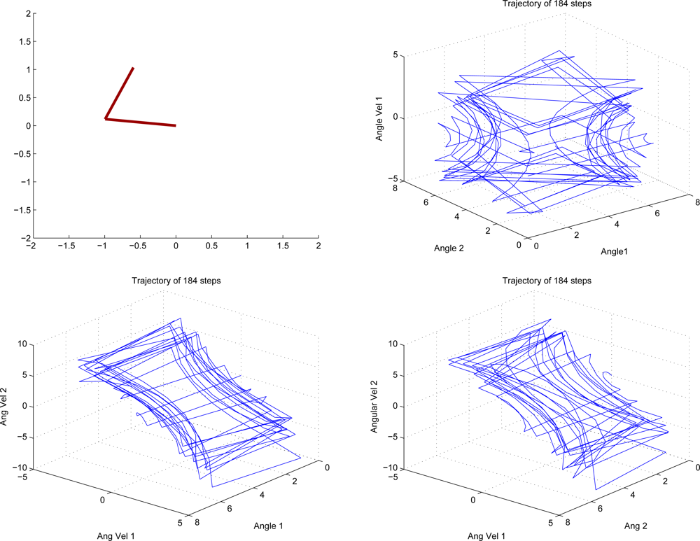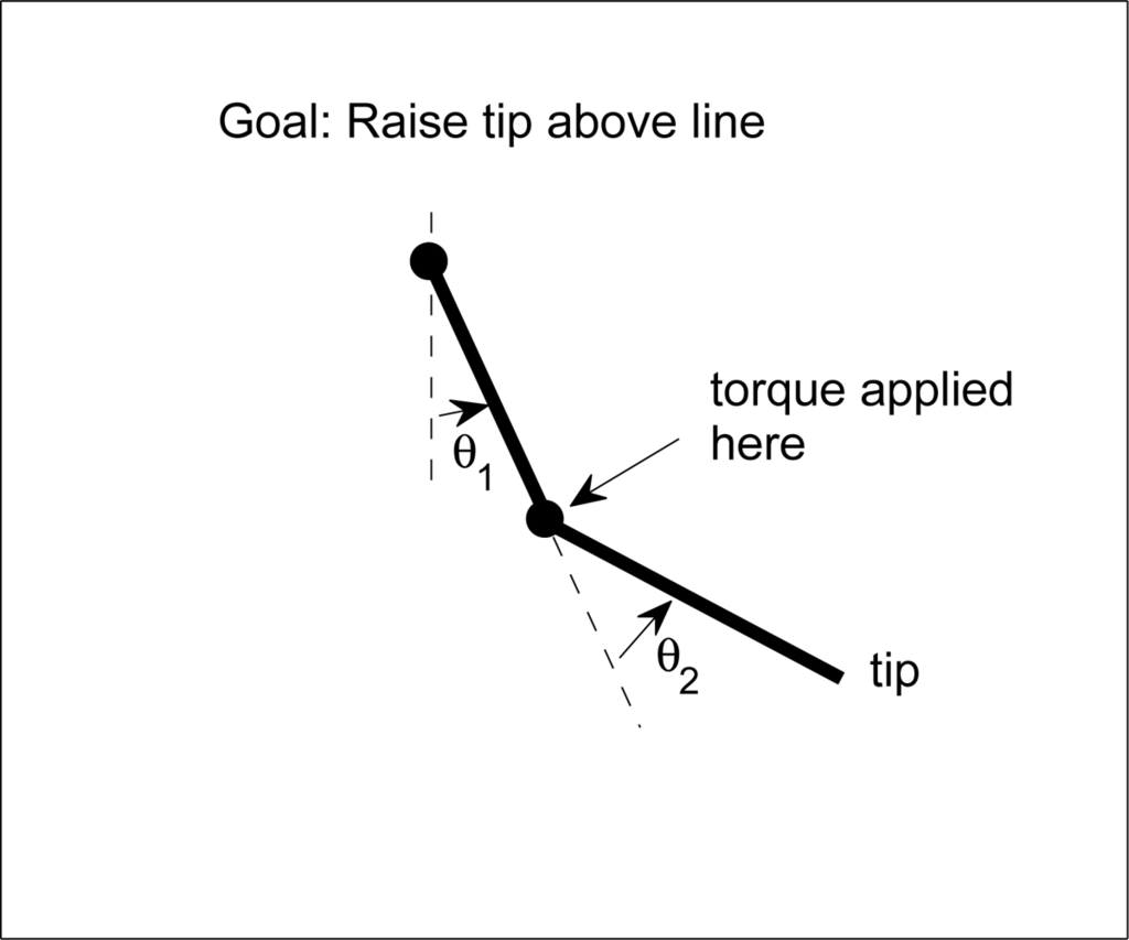 The Acrobot is an under-actuated double pendulum which is a typical working benchmark for its nonlinear dynamics. It consists of two arms where torque can only be applied at the second joint. The system is described by four continuous variables: the two joint angles, θ1 and θ2, and the angular velocities, θ̇1 and θ̇2. There are three actions corresponding to positive (a = 1), negative (a = −1), and zero (a = 0) torque. The time step was set to 0.05 and actions were selected after every fourth update to the state variables according to the equations of motion. The goal for this domain is to raise the tip of the second link above a certain height in minimum time (we used a height of 1, where both links have a length of 1). The reward function is therefore −1 for each time step until the goal is achieved and the discount factor is γ = 0.99. Episodes begin with the all state variables at value 0 which corresponds to the two links hanging straight down and motionless. Figure 3 is an illustration figure of Acrobot. Figure 4 shows a snapshot of a successful run.