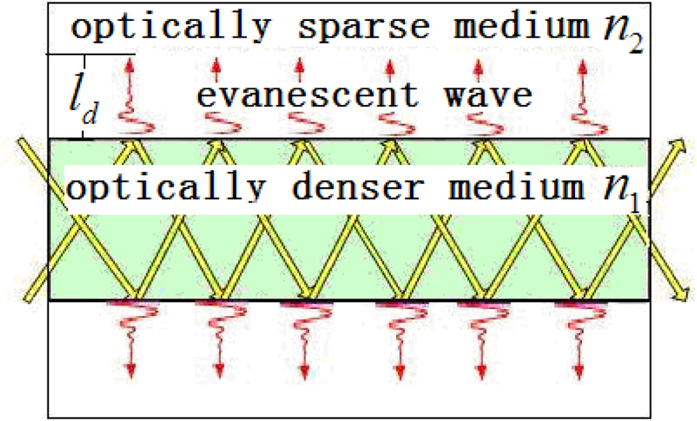 LSPR is an important feature of metal nanoparticles, and can be generated by the evanescent field. Evanescent field strength and surface modification are the two central elements of the current research. LSPR of the fiber surface can be enhanced through properly choosing the light wavelength and the media of the evanescent field. Figure 1 illustrates light transmission in the fiber. The evanescent wave transmits exponentially in a vertical direction. The principle of the sensitivity improvement is that LSPR is sensitive to the change in strength of the local electric field in different media. Subsequently, the intensity of light when transmitted through the nanoparticle-modified fiber changes markedly in different media.
