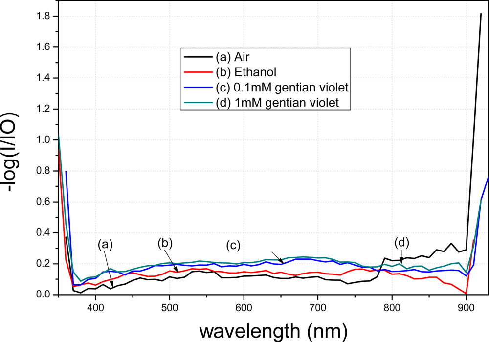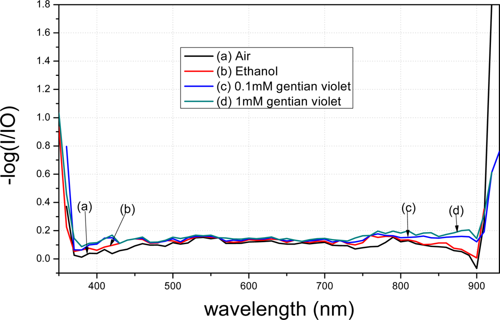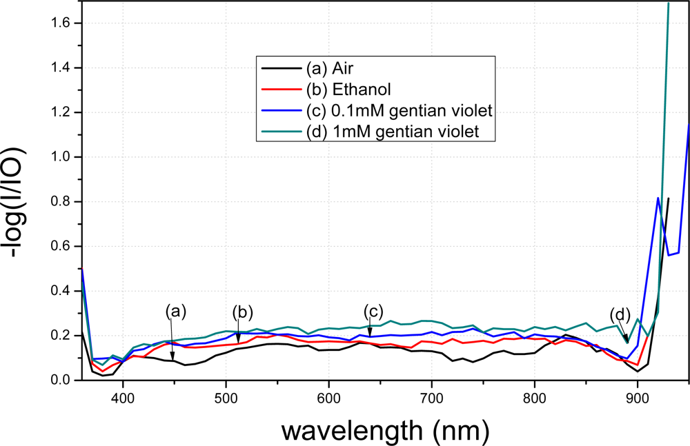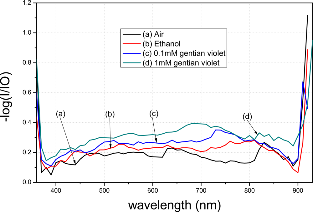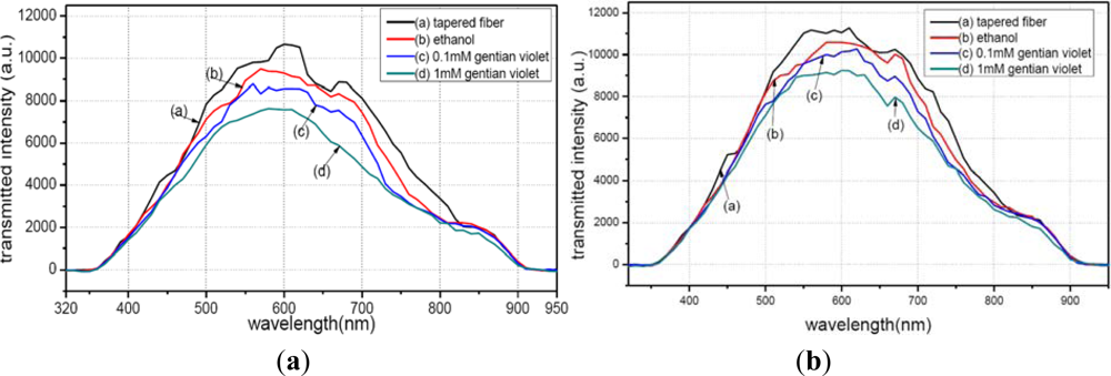 The spectra of the fiber modified using APTMS after gold-nanoparticle conjugation are shown in Figure 8. Curve (a) denotes the spectrum of the modified fiber in air. Curve (b) represents the result when the modified fiber was placed in 98% ethanol; a clear decrease compared to curve (a) is evident. Curve (c) shows the result when the modified fiber was placed in 0.1 mM gentian violet. Curve (d) shows the result when the concentration was raised to 1 mM. Different concentrations resulted in different peak values in the transmission spectra. Furthermore, the transmission spectra of the fibers modified by the gold nanoparticles in APTMS varied when the solutions were changed.