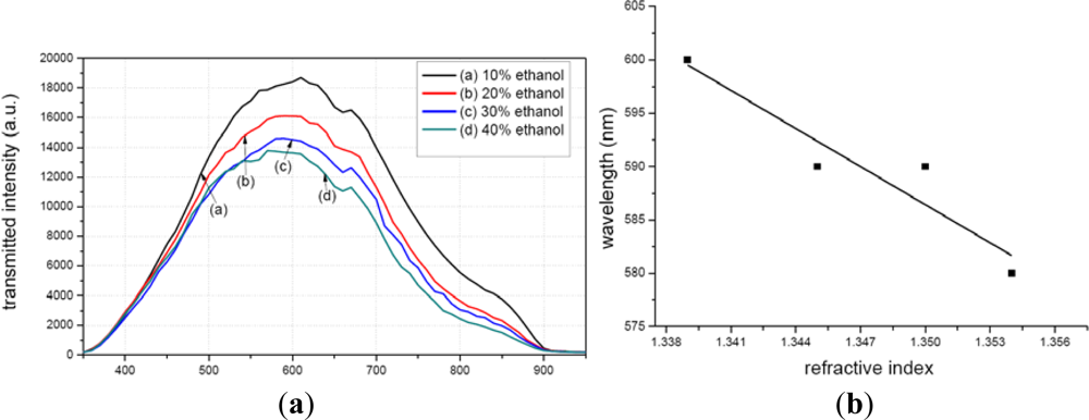 Figure 14(a) illustrates the transmission spectra of the MPTMS-modified fiber tested in different concentrations of ethanol. The peak value occurs at different wavelengths for difference cases, i.e., at 600 nm for 10% ethanol, 590 nm for 20% and 30% ethanol, and 580 nm for 40% ethanol. The refractive index is also different with different concentrations ethanol. Figure 14(b) illustrates the relationship between wavelengths and refractive index, based on which the refractive index sensitivity of MPTMS-modified fiber could be obtained as 1,190.5 nm/RIU.