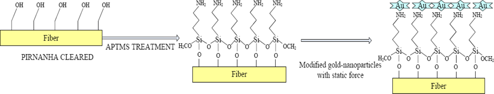 Gold nanoparticles can be modified by APTMS under electrostatic force, which is a type of intermolecular force. Polar molecules have dipole matrices and the electrostatic; interactive forces among the dipole molecules comprise the electrostatic force. Figure 3 illustrates the principle of surface modification using gold nanoparticles and self-assembly on the tapered fibers in APTMS. A piranha solution can remove the retained plastic cladding and transform the groups to hydroxyl on the fiber surface. After the fiber is treated with APTMS, amino groups are formed on the fiber surface [17]. The gold nanoparticles have negative electric charge, whereas the amino groups have positive electric charge. The produced electrostatic force between them results in the self-assembly of the gold nanoparticles on the treated fiber surface [18].