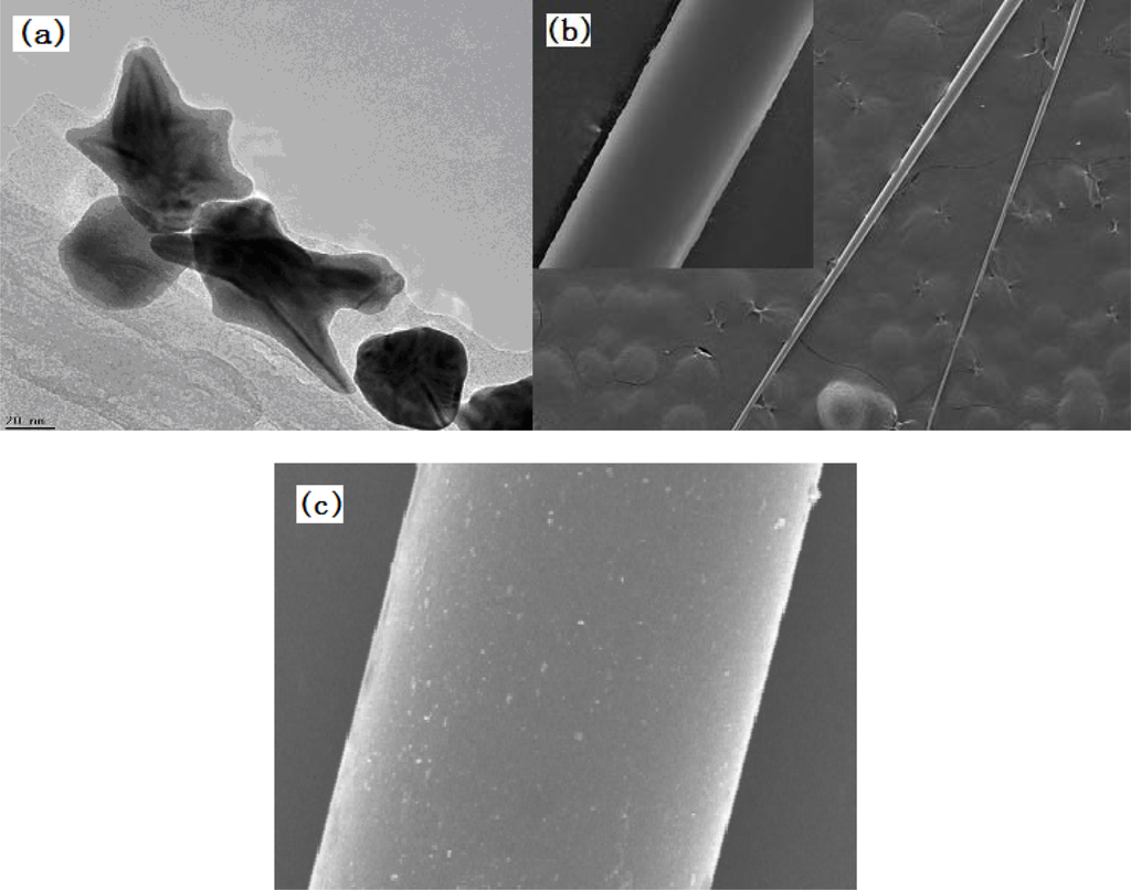 Figure 5(a) shows the obtained star-shaped gold-nanoparticles 80 nm to 120 nm in size characterized using a transmission electron microscope. After conforming to the desired shape and size of the particles, the conditions of the surface modification are characterized via SEM, as shown in Figure 5(b,c).