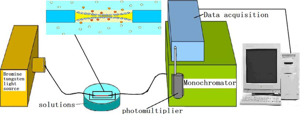 Highly efficient microsensing systems are in demand because of their lower cost and smaller risk in launch [1]. As useful tools for measurement and analysis, optical biosensors find wide application in biorobotics, healthcare, pharmaceuticals, environmental monitoring, homeland security, and battlefield use [2]. The use of biosensors for the diagnosis of diseases, food testing, and environmental detection of biological agents has increased remarkably over the past decades. A fiber optic localized surface plasmon resonance (FO-LPR) chemical and biochemical sensing platform has undergone rapid development recently [3,4]. To apply fiber optic technology to biosensors, numerous challenging issues must be addressed, including surface immobilization (e.g., analyte capture efficiency and elimination of nonspecific binding, among others) and detection format (e.g., direct binding, sandwich-type binding, and competitive binding) [5]. The current paper discusses the application of surface immobilization technology in fiber optical sensing. Surface plasmon resonance (SPR) technology is used to detect the concentration of biomolecules in solution, under the condition that surface immobilization on the tapered fiber is stable and uniform.