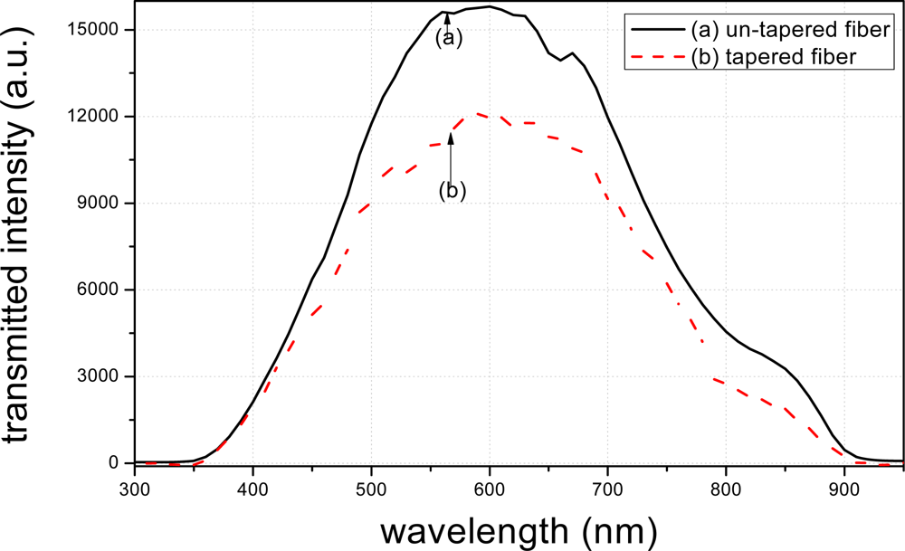 Figure 7 illustrates the transmission spectra of the tapered and un-tapered fibers. It is seen that the peak value of the transmitted intensity of the un-tapered fiber is more than 15,000 a.u., which is higher than that of the tapered fiber. This result indicates that the structure of the tapered fiber results in more light-leakage, and meanwhile, the evanescent field is enhanced through fiber tapering.