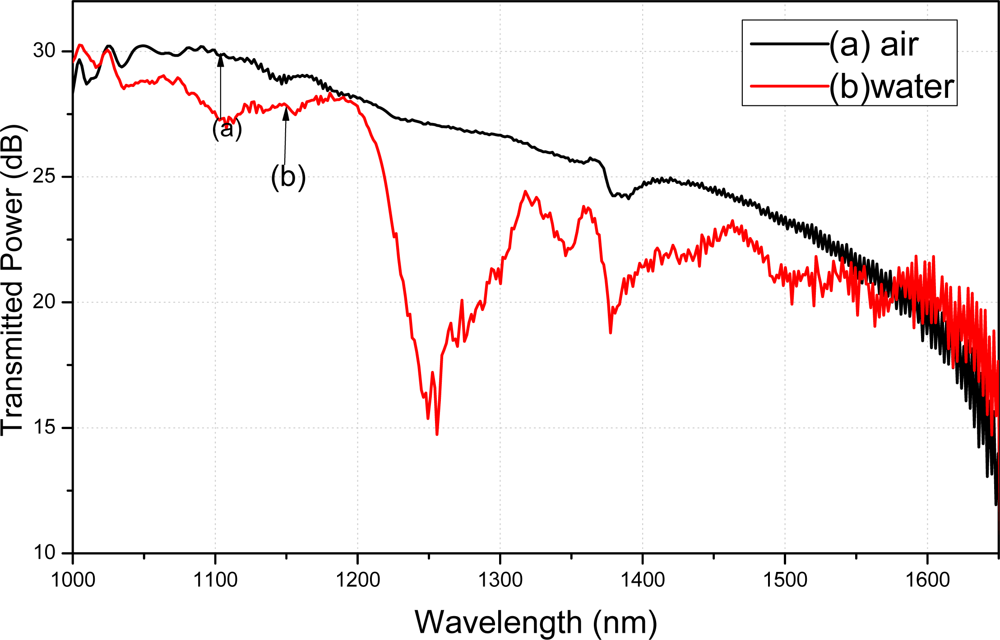 The transmitted power spectra of the silane coupling agent modified fiber were tested in air and water. Water absorption peaks appeared on the transmitted power spectra if the silane coupling agent absorbed the water molecules on the fiber surface. The absorption peaks of water indicate that the silane coupling agent was uniformly modified on the fiber. Because the modification methods of APTMS and MPTMS on the fibers surface were the same, only the transmitted power spectra of APTMS modified fiber were reported in the current paper.