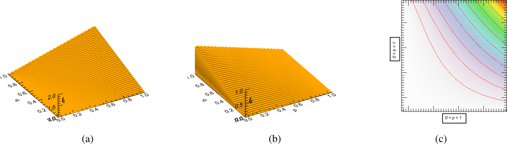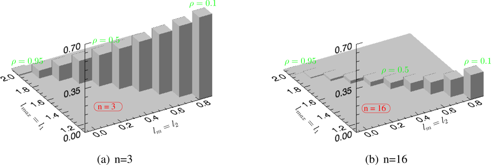 Figure 5 shows the expected value (first order moment) of the maximum sample eigenvalue λmax as a function of the true eigenvalues lmax for a fixed number of samples n = 3 and k = 1. The variation of the underlying correlation of the true covariance matrix ρ, which changes the values of lmax, has been as well indicated in a color code. Observe that the higher the correlation is, the higher lmax becomes.
