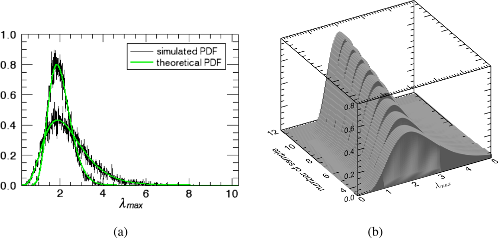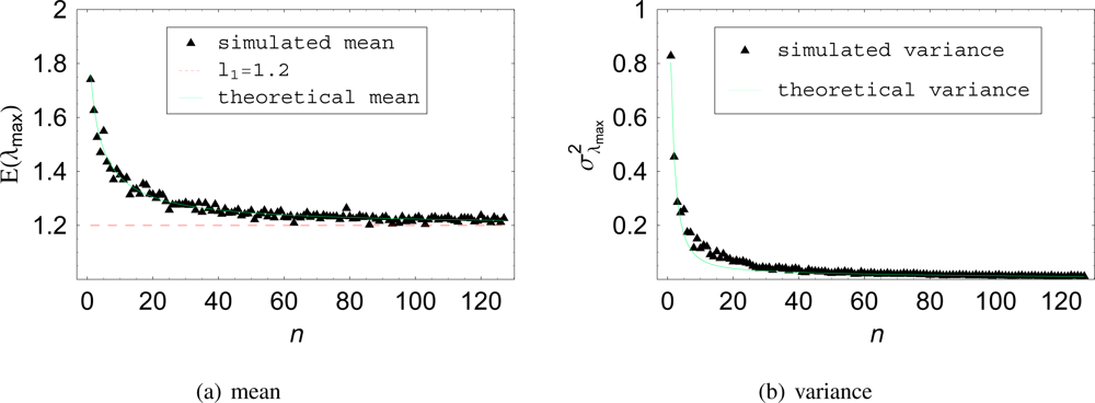 Figure 2(a) shows the comparison of the Equation (4) with simulations. The theoretical PDF curves clearly agree with the histograms obtained from simulated data. As expected, the PDFs become narrower with increasing n, indicating less variance around the true value of the maximum eigenvalue l1 = 1.8. This behavior can be better seen in Figure 2(b) where the distribution of λmax as a function of the number of estimation samples n is presented. Note also that the expected value of the distributions seems to change for different n.