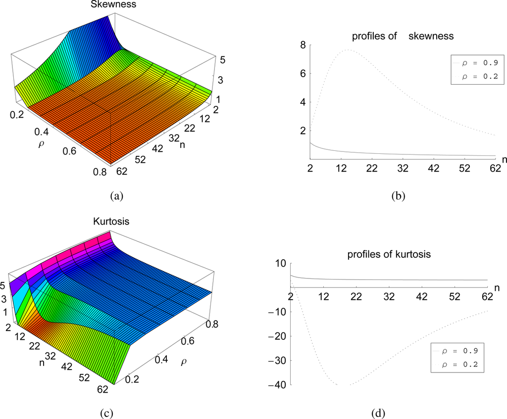 The impact of the correlation and the number of samples on the behavior of the third (skewness) and fourth (kurtosis) order moment of the maximum sample eigenvalue λmax is presented in Figure 4. Skewness is a measure of how symmetrical the distribution is with respect to its mean. Figure 4(a,b) indicates that the skewness of λmax converges to zero for increasing n and increasing ρ, expressing the tendency to a symmetrical distribution in that cases.