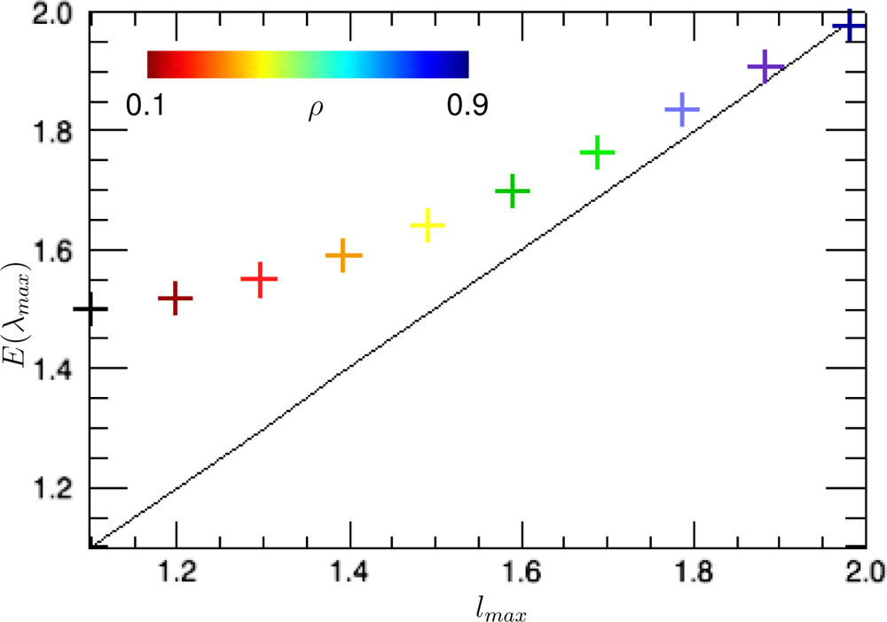 The bias of the estimator of a certain parameter is defined as the difference between the expected value of the estimator and the true value of the parameter. In the present case, the bias is hence given by E[λmax] − lmax. Notice thus from Figure 5 that the bias of λmax becomes very strong for low values of the correlation lmax (or equivalently, low values of ρ).