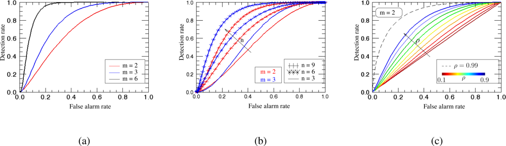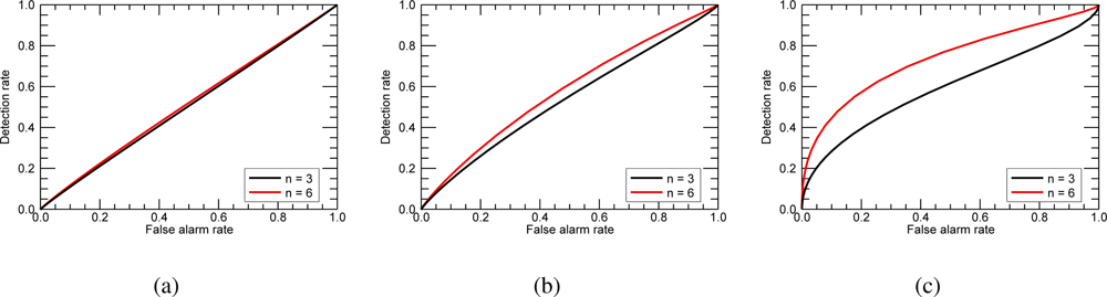 For each value of , there exists a pair (PFA, PD). The curves of PD versus PFA are called Receiver Operating Characteristic (ROC) curves and express the detection performance. The more a ROC curve bends toward the upper left, the better is the detection performance since a higher PD and lower PFA is achieved.