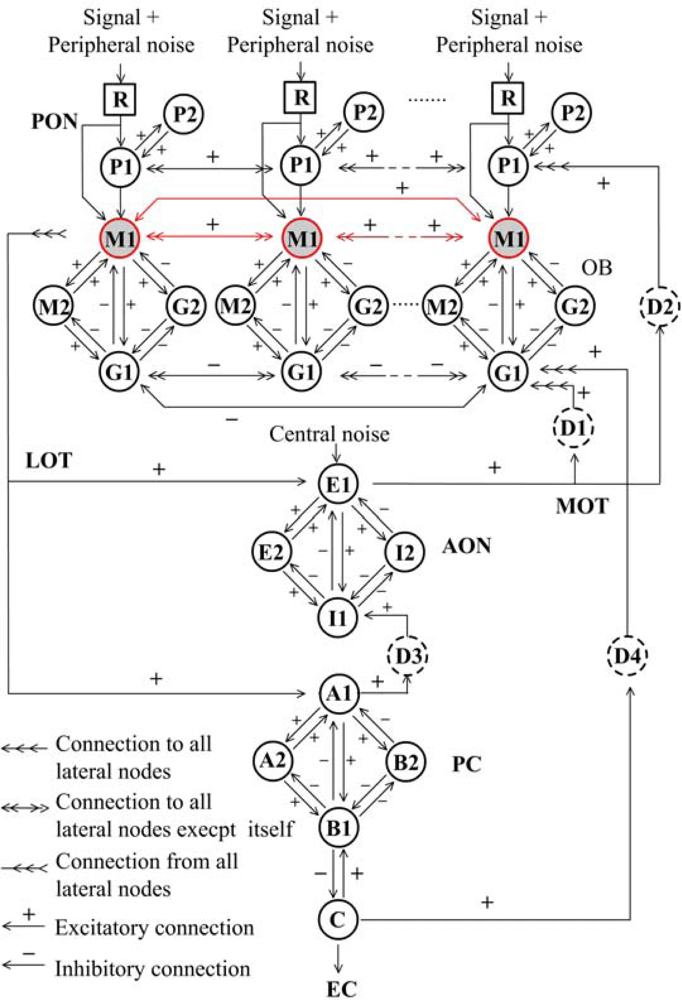 Over the last decades of study on mammalian olfactory system, Freeman and his colleagues [–] developed an olfactory model entitled KIII, which appropriately describes the whole olfactory pathway from sensory neuron to olfactory cortex, as well as offering a probable interpretation of principle of biological olfaction in the concept of mesoscopic neurodynamics []. The KIII model is a massively parallel architecture with multiple layers coupled with both feed-forward and feedback loops through distributed delay lines, as shown in Figure 1. External stimulus signals from receptors (R) transmit to periglomerular cells (P) and then to the olfactory bulb (OB) layer via the primary olfactory nerve (PON) in parallel. The OB layer consists of a set of mutually coupled neural oscillators, each being formed by two granule cells (G) and two mitral cells (M). Then the total output of all M1 nodes transmits via a lateral olfactory tract (LOT) to the anterior olfactory nucleus (AON) and prepyriform cortex (PC) layer, which provides the final output of the system to other parts of the brain from deep pyramidal cells (C), meanwhile back to the OB and AON layers [].