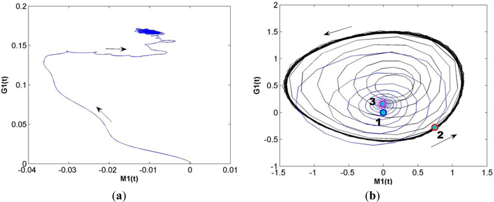 The operation of learning and memorizing in the KIII model can be described as follows. The system with no stimuli is in a high dimensional state of spatially coherent basal activity, presenting a chaotic global attractor in phase space; while with external stimulus the system will soon turn to a γ-range of quasi-periodic burst, presenting a local basin of an attractor wing in phase space. Using some learning rules to adjust lateral connection weights in the OB layer, the model is able to remember a number of odor patterns. When a familiar odor presents again, its spatiotemporal pattern will soon transmit to a corresponding local attractor. Figure 2(a) shows the trajectory with M1 node and G1 node of the same channel in phase space without any stimuli (peripheral noise and central noise still exist). Figure 2(b) shows the trajectory before stimulation (blue curve of Note 1), during stimulation (black curve of Note 2) and after stimulation (black curve of Note 3). It can be seen that the system state changes quickly as stimuli change.