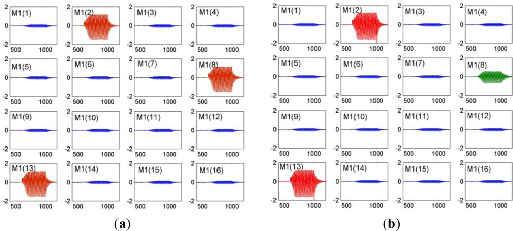 Figure 3 shows pattern reproduce and retrieval of a 16-channle KIII model with simple Hebbian learning rule. Every subplot presents an amplitude modulated pattern (AM) output of each M1 node in the OB layer. Figure 3(a) is pattern output of learned pattern P = [0 1 0 0 0 0 0 1 0 0 0 0 1 0 0 0]. The consistent channel position and amplitude with pattern P demonstrate a memory recall. Figure 3(b) is pattern output of an incomplete version P’ = [0 1 0 0 0 0 0 0 0 0 0 0 1 0 0 0]. Compared with pattern P, there is an AM burst in input-absence channel M1(8) (green curve), demonstrating a good pattern recovery property.