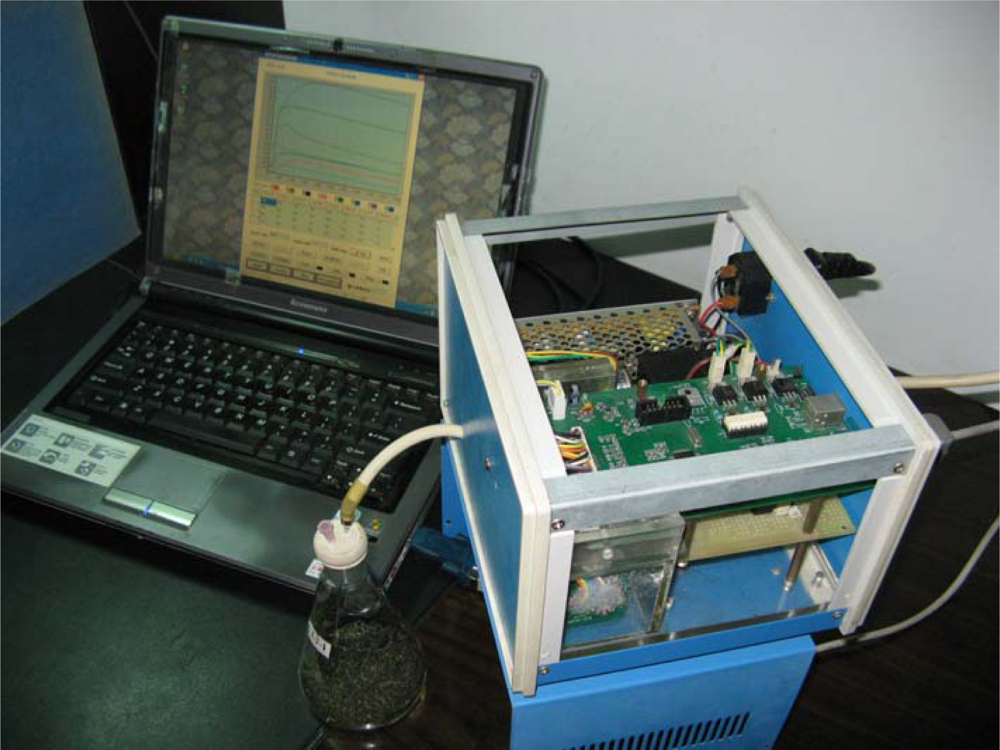 A homemade electronic nose system has been developed for data acquisition, as illustrated in Figure 4. Eight MOS Taguchi-type gas sensors (TGS832, TGS880, TGS800, TGS822, TGS826, TGS825, TGS816 and TGS812) were purchased from Figaro Engineering Inc. (Osaka, Japan). They are arranged in two PCB boards with corresponding voltage divider circuits, and then fixed in a sealed gas chamber with a volume of 315 mL. Two micro-bumps (0.5 L/min) are connected to the chamber for aroma sampling and exhausting. The measurement are controlled, monitored and recorded by homemade Delphi software in a computer which connected to a microprocessor-based circuit (MSP430 with a 12-bit ADC) via a RS-232 cable.