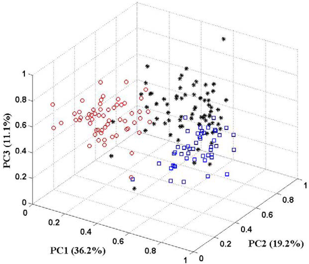In this paper, the PCA technique is used for feature selection. The aim is to pick out patterns in multivariate data and reduce the dimensionality of the input vector without a significant loss of information. PCA can also help to get an overall view of these data through giving an appropriate visual representation with fewer dimensions. Figure 5 shows the 3D-PCA plot of three classes of wine. Examining the PCA plot, the first three principal components (PCs) account for 66.5% of the variance of the data. There is not a good clustering of three classes in 3D plot. Some samples of one class drift into feature spaces of other classes. It implies that the first three principal components do not represent sufficient information for the data set. The some other of principal components should be put in to preserve more of the relevant information of the original data. There are some guidelines for determining the optimal amount of PCs [,]. In the following part of this section, more than three principal components will present to the KIII model as feature vector. And the correct classification rates are calculated to make sure how many principal components are sufficient.