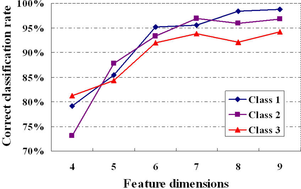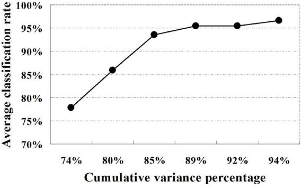 Five samples in each class of wine data set were randomly chosen for training set and the others were used for testing. The first n principal components are selected as input feature vector for n-channel KIII model. The parameters of the KIII model in this paper are hhab = 0.5487, hHeb = 0.0395, RHeb = 1.5 and the others are from []. The 4th-order Runge-Kutta method with a fixed step of one (1,200 steps total) was applied for numerical integration of the ODEs. The average correct classification rates of ten trials are presented in Table 1, as well as in Figure 6. From the plot, it is very clear that the classification performance of the KIII model gradually become better and better as PC numbers increasing. Figure 7 shows the average correct classification rates of three classes with the increasing of cumulative variance percentage (CVP). Roughly speaking, more than 85% of CVP would represent sufficient information of the data set, and could get 90% of correct classification rate. However, the running time of KIII model implementation increased correspondingly. Considering the trade-off between time consumption and classification rate, the optimal dimension of feature vector is about seven in this classification task.