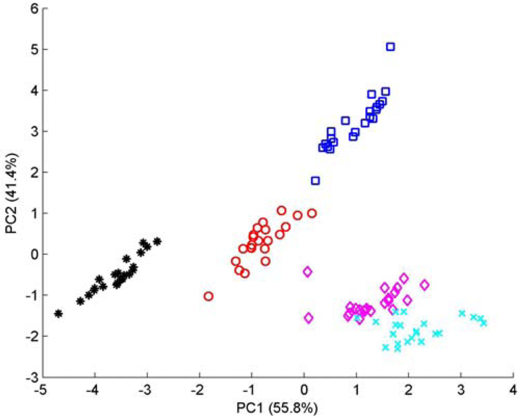 Five brands of commercial green tea derived from five different provinces of China, i.e., Anhui, Henan, Hubei, Sichuan and Zhejiang (labeled as Class 1 to Class 5 in turn), represent different cultivars and tea-making process technology. For each brands of green tea, 22 measurements were made through the customized e-nose instrumentation described in Section 2.3. Every measurement lasted more than 400 sec with a sampling rate of 20 Sa/sec, and yielded a large data matrix. PCA was also used here to investigate how the response vectors from sensor arrays cluster and reduce the dimensionality of the raw data. Figure 8 shows the 2D-PCA plot of five classes of green tea. Examining the PCA plot, the first two principal components account for 97.26% of the variance of the data-set (PC1 and PC2 accounted for 55.83% and 41.43% of the variance, whereas PC3 and PC4 accounted for 1.96% and 0.53%, respectively). Despite the slight overlap of two clusters, we can easily observe an excellent discrimination of the five kinds of green tea.