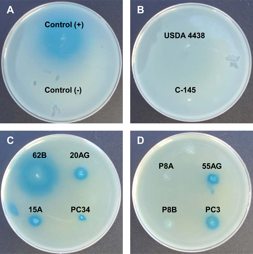 AHL-like molecules in peanut-nodulating strains were detected using the biosensor strains A. tumefaciens NTL4 (pZLR4) and C. violaceum CV026. None of the tested strains showed positive results for the C. violaceum CV026 bioassay, indicating that the strains were unable to synthesize AHL-like molecules having short acyl chains. On the other hand, results of the A. tumefaciens NTL4 (pZLR4) bioassay revealed that some strains were able to produce AHL-like molecules with long acyl chains. A positive result consisted of the presence of a blue halo around a colony resulting from hydrolysis of X-Gal, as shown in Figure 1. Of the 53 strains analyzed, 14 (26%) were able to synthesize AHL-like molecules with long acyl chains (positive result), two (4%, indicated as +/−) showed an undefined result, and the remaining 37 (70%) showed a negative result for the production of AHL-like molecules by A. tumefaciens NTL4 (pZLR4) (Table A1).