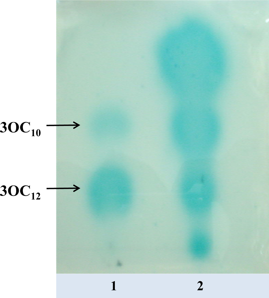 Aliquots (10 μL) of AHL extracts were analyzed by reverse-phase C18-thin layer chromatography (RP-C18 TLC) using methanol/water (60:40 v/v) as the mobile phase. The plates were air-dried, overlaid with AB medium, 0.7% agar containing X-Gal 40 μg mL−1, and the biosensor A. tumefaciens NTL4 (pZLR4), and incubated overnight at 30 °C [32].