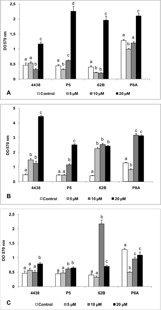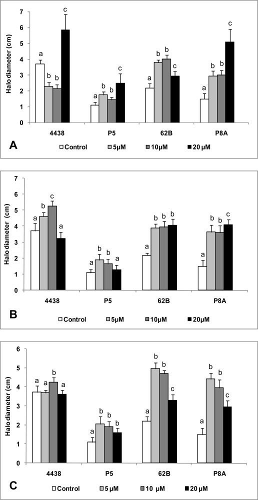 The effect of various concentrations of exogenously added 3OC14 AHL was strain-dependent (Figure 4(C)). This molecule only slightly modified biofilm formation by P5 and USDA 4438. Surprisingly, an intermediate concentration (10 μM) of C14 AHL greatly increased biofilm formation by 62B strain, whereas all C14 AHL concentrations tested reduced biofilm formation by P8A relative to control (Figure 4(C)).