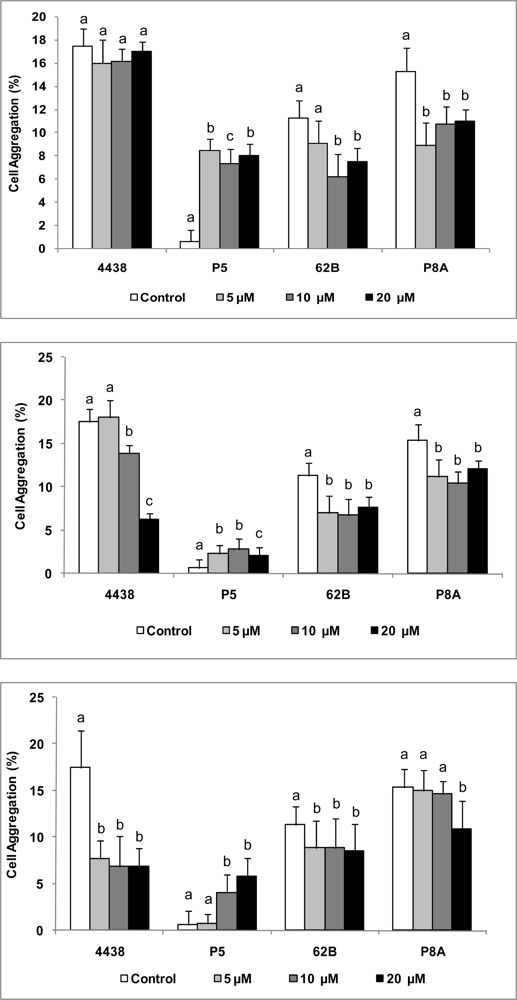 Under our experimental conditions, the peanut-nodulating Bradyrhizobium strains studied showed a low capacity for cell aggregation, with values ranging from ∼5–20%. In comparison to controls, the addition of exogenous AHLs caused decreased autoaggregative ability in all strains except P5, which showed a slight increase (Figure 5(A,B,C)). All concentration of 3OC10 AHL produced the greatest increases in autoaggregation of P5, with values ∼10-fold higher than those of controls (Figure 5(A)). 3OC12 (Figure 5(B)) and 3OC14 AHLs (Figure 5(C)) showed effects that were similar to but smaller than that of 3OC10 AHL. Autoaggregation of USDA 4438 was not affected by addition of 3OC10 AHL, but autoaggregation of 62B and P8A decreased in response to increasing concentrations of this autoinducer (Figure 5(A)). A negative dose-dependent effect by 3OC12 AHL was observed on autoaggregation of USDA 4438, and a negative dose-independent effect by this autoinducer was observed on autoaggregation of 62B and P8A (Figure 5(B)). Exposure to any concentration of 3OC14 AHL significantly reduced autoaggregation of USDA 4438 and 62B, and a high concentration (20 μM) of this autoinducer reduced autoaggregation of P8A (Figure 5(C)).