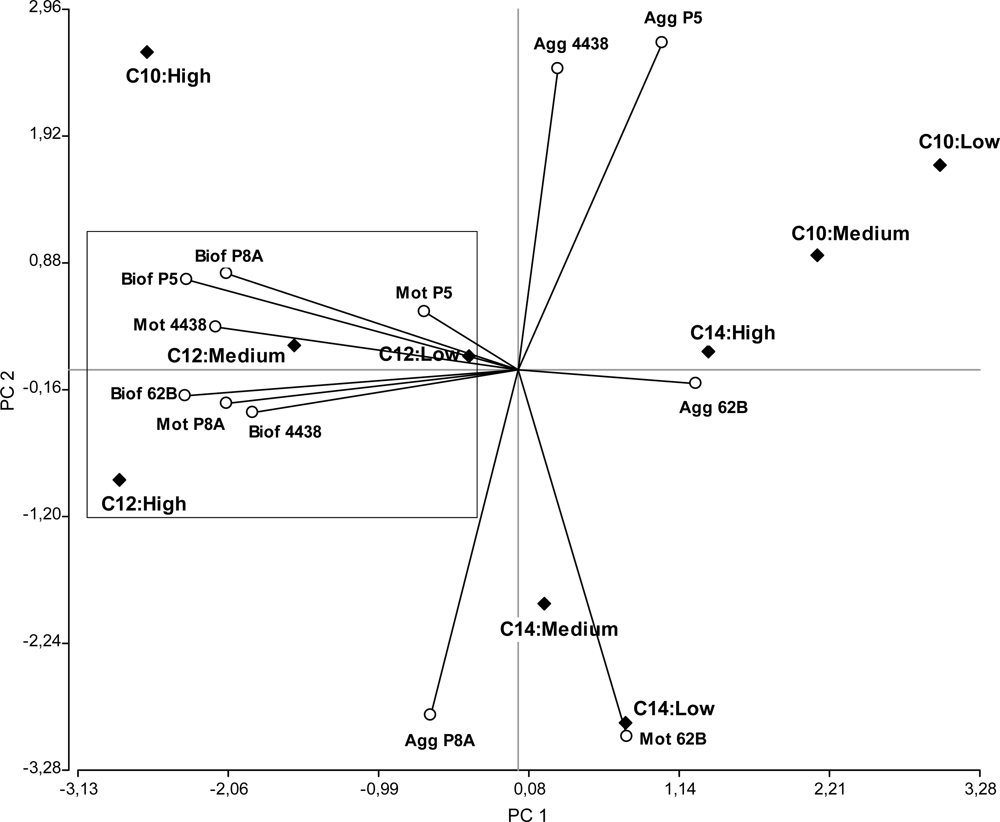 According to the PCA, the analysis of all data in three dimensions (PC1, PC2, and PC3) explained ∼80% of the total variability in the study. The graph generated according to PC1 and PC2 (which explained ∼60% of the variability) (Figure 6) shows that motility and biofilm formation were processes regulated by the influence of 3OC12 AHL. Similarly (although not conclusively), it appears that 3OC10 and 3OC14 AHLs affect the autoaggregative process.