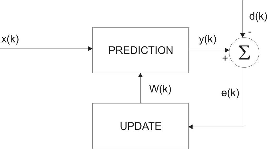 The proposed hypothesis states that long trajectories of the pointer correspond to voluntary movements whereas rapid changes are involuntary. As a consequence, the filter should dynamically adapt its gain according to trajectory deviations. An adaptive filter is time-varying since its transfer function is continually adjusted and driven by a reference signal that depends on the application. The general adaptive-filtering block diagram consists of the prediction and update steps as depicted in Figure 2. The parameter k is the iteration number, x(k) denotes the input signal, y(k) is the output signal and d(k) defines the desired signal. The error signal e(k) is the difference between d(k) and y(k). The filter coefficients W (k) are updated as stated by the error signal.