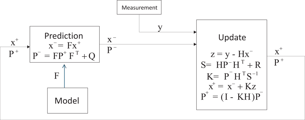 The application of a standard linear Kalman filter requires that the dynamics of the target is represented as a state space model [44]. A simple kinematics approach based on the assumption of the constant velocity process is suggested by some authors, and is shown to track voluntary movements correctly. Figure 3 illustrates the block diagram of the Kalman filter.