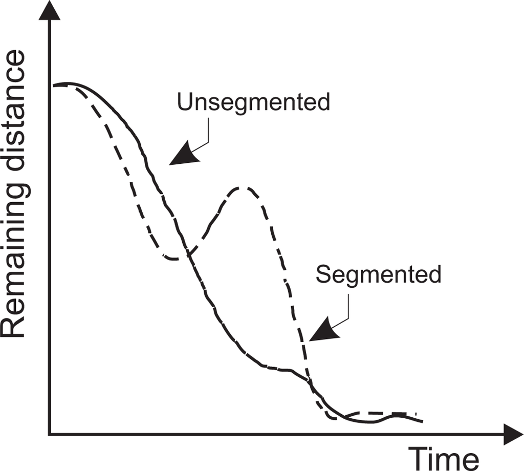 The filtering algorithms BBF, KF and RKF were applied offline to the previously captured data (Section 3). The performance was compared using a metric called segmentation [47]. Segmentation measures the decomposition of a complex motion into a sequence of simpler movements that are called sub-movements. It is based on extracting maximum distance points during the reaching task. By means of segmentation, overshoots and undershoots can be detected. This metric offers information on the motor performance of both healthy subjects and persons with CP. Figure 6 illustrates an example of segmentation.