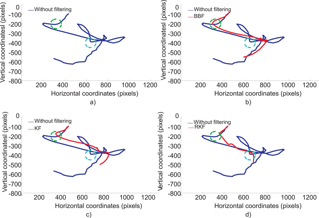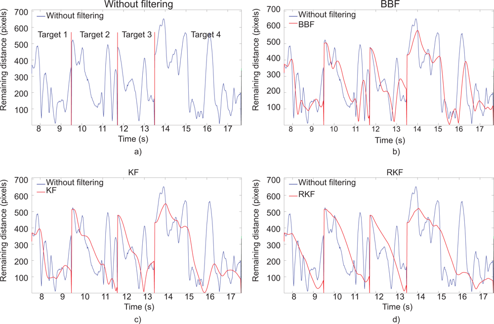 The effect of the filtering techniques can be shown graphically. Figure 7 depicts the target-reaching trajectory without the adaptive filter and with BBF, KF and RKF. Figure 8 shows the remaining distance versus time without and with adaptive filters for four consecutive targets. Table 5 shows that the RKF had the best performance followed by the KF and BBF. Although the BBF is able to filter high-frequency movements, it had lower performance than RKF. The reason is that BBF responds faster to changes in movement (involuntary movements) that is undesired. The detection and elimination of outliers (sub-movements following the initial movement), included by the RKF, are more adequate for this application. The gain filter is modulated in real-time and is lower during straight paths in which the prediction error is smaller. By means of outliers suppression and the dynamic gain filter, the initial movement that rapidly covers distance is smoothly filtered, whereas the movements around the target are filtered more strongly. As a consequence, the filtering technique facilitates fine control.