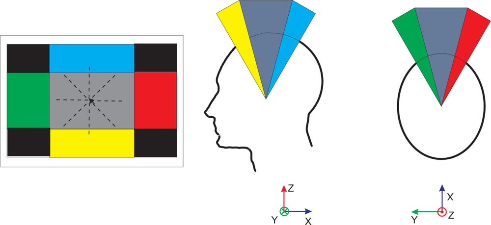 Abnormal postures can be identified by measuring the spatial variables such as predominant head orientation and ROM. Neck/head motion is clinically described as rotations about 3 orthogonal axes embedded in the head. Euler angles are useful for describing human motion such as head movement because they define rotation using three angles that can easily be physically related to frontal, sagittal, and transverse (α, β, γ) axes that are calculated using Equation (1). ROM is defined as the difference between the maximum and minimum values of α, β and γ. We calculate the ratio between the range needed to reach a target and the total range. If the ratio is less than 1, the subject moved his/her head between the screen limits; otherwise the head was out of range. α is given as absolute value because frontal rotation does not produce pointer displacements.