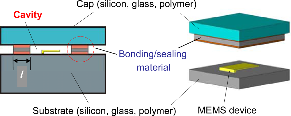 A schematic of a typical MEMS package of interest is shown in Figure 1. As illustrated in the figure, the package comprises of a cap and a substrate bonded to each other such that they enclose a cavity between them which houses the MEMS device. Cavity volumes are typically less than 10−3 cm3.