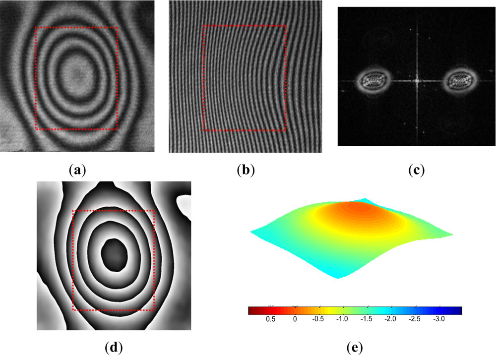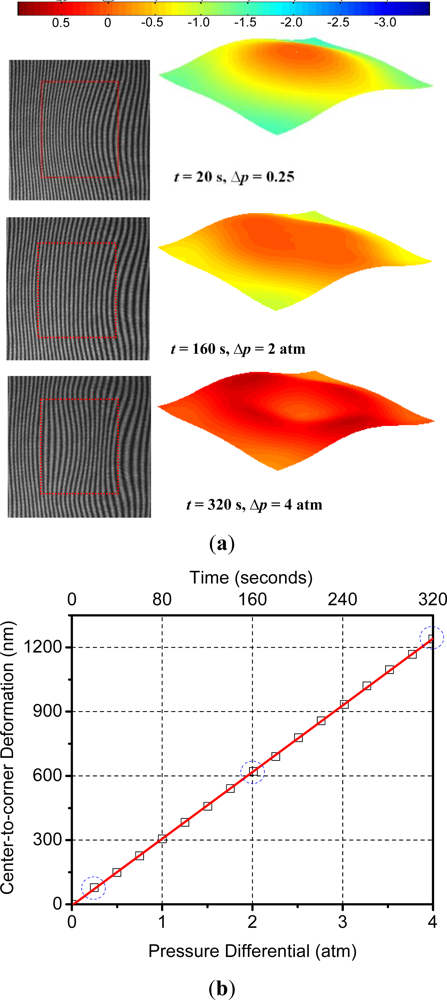 The original fringe pattern of the specimen before pressurization is shown in Figure 10(a). A carrier pattern of constant displacement gradient is added to the original pattern by a small rigid body rotation of the specimen; the number of carrier fringes over the cavity was about 20 which was equivalent to 6.3 μm. The modulated pattern is shown in Figure 10(b). After the two-dimensional FFT, the real harmonic is isolated in the frequency domain [Figure 10(c)]. The center of the spectrum is moved to the origin of the frequency axis to remove the carrier frequency in the frequency domain. Then, the inverse Fourier transform is performed to restore the original phase map [Figure 10(d)]. Unwrapping of this phase map yields a fractional fringe orders with high fidelity at every point. This information is used to generate a 3D deformation map shown in Figure 10(e). The configuration used in the experiment offered the displacement measurement resolution of ±15 nm and the pressure regulation accuracy of ±0.3 psi (±0.02 atm).